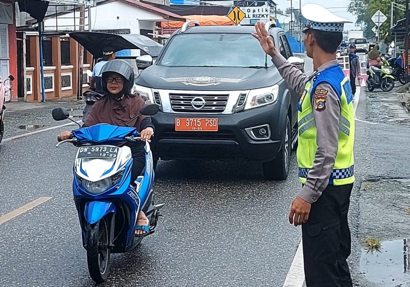 Meski Hujan, Personil Satlantas Turun Lakukan Gatur Lalin dan Sampaikan Himbauan