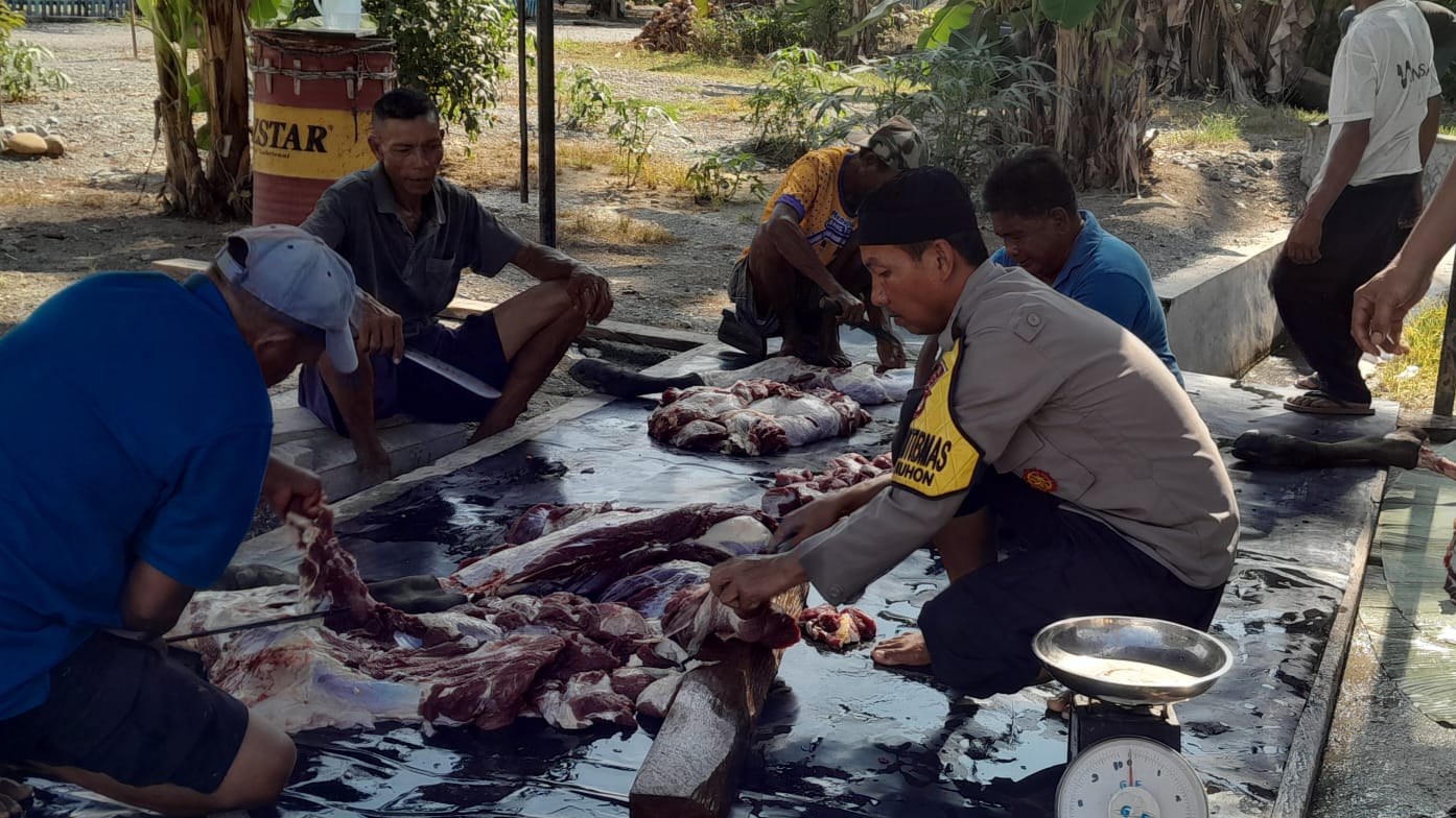 Di tengah kegiatan itu, Bhabinkamtibmas Polsek Nuhon Bripka Samsul Huda, juga turut serta membantu secara langsung proses penyembelihan hewan kurban.