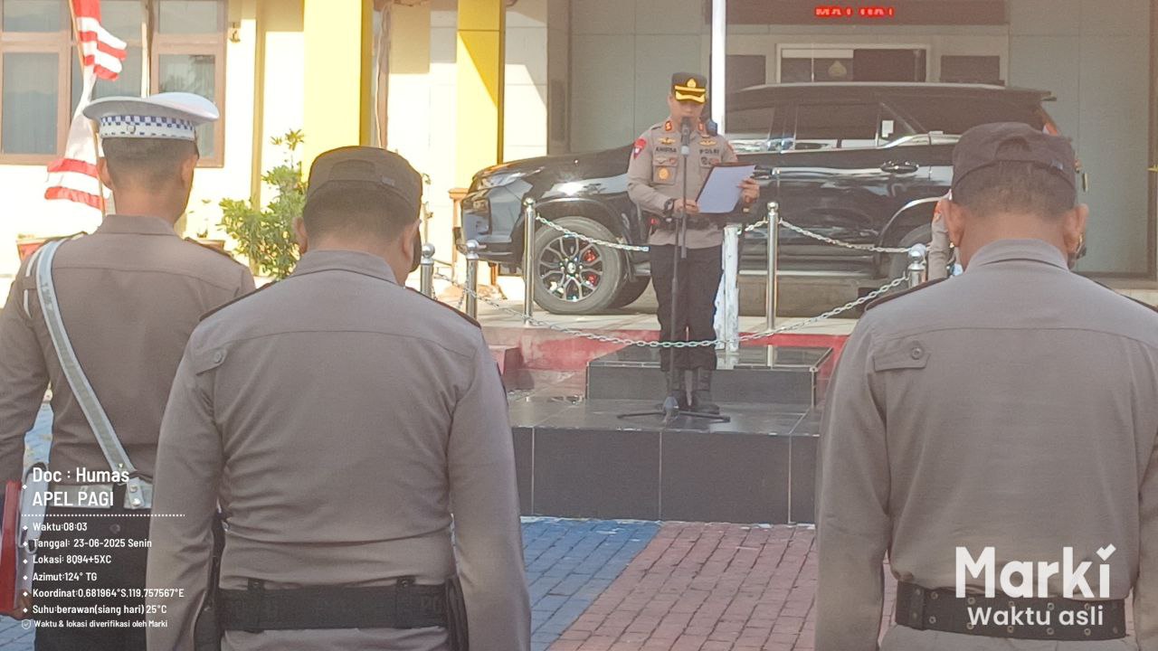 Seluruh personel Kepolisian Resor (Polres) Donggala melaksanakan kegiatan apel pagi yang berlangsung di Lapangan Apel Mako Polres Donggala, Senin (23/6) sekitar pukul 08.00 WITA.