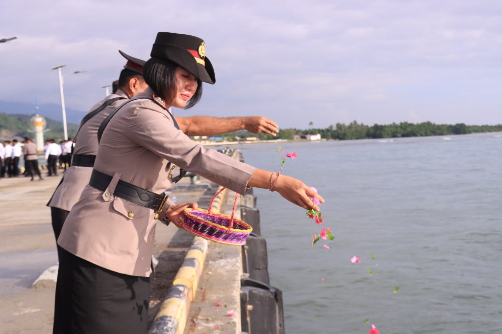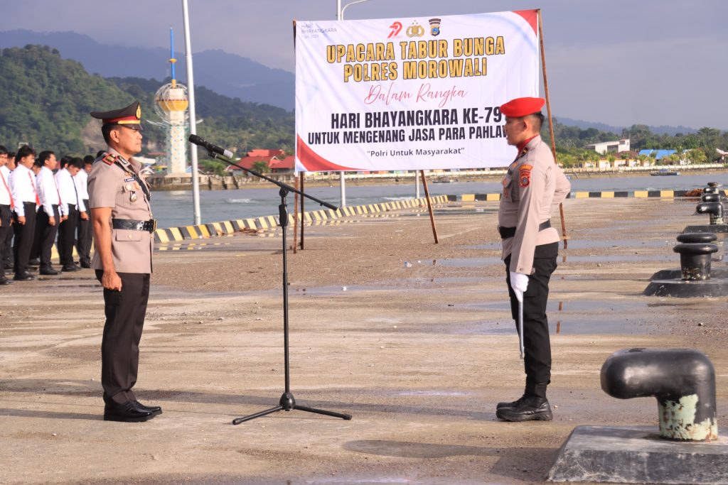 tribratanews, MOROWALI – Dalam rangka memperingati Hari Ulang Tahun (HUT) Bhayangkara ke-79 tahun 2025, Kepolisian Resor (Polres) Morowali Polda Sulawesi Tengah melaksanakan upacara tabur bunga yang berlangsung khidmat di Pelabuhan Bungku, Kelurahan Marsaoleh, Kecamatan Bungku Tengah, Kabupaten Morowali, pada Kamis 26 juni 2025 pagi.