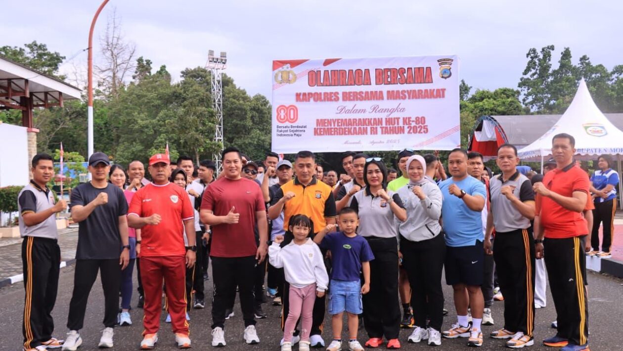 MOROWALI, tribratanews.sulteng.polri.go.id – Dalam rangka menyambut Hari Ulang Tahun ke-80 Kemerdekaan Republik Indonesia, Polres Morowali menggelar olahraga bersama yang diikuti Polres dan jajaran, Bhayangkari, serta masyarakat, bertempat di Alun alun rumah jabatan Bupati Morowali pada Jumat (15/8/2025).