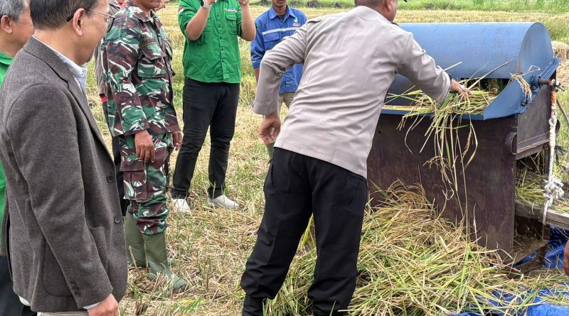 Tribratanews.sulteng.polri.go.id – Kapolsek Toili, AKP Raden Hermawan hadiri panen Padi bersama program implementasi system pertanian terpadi ITB pemanfaatan limbah biosulfur