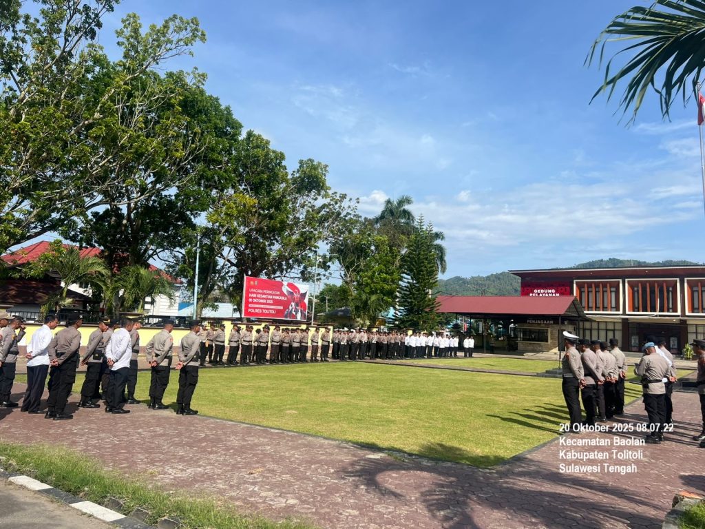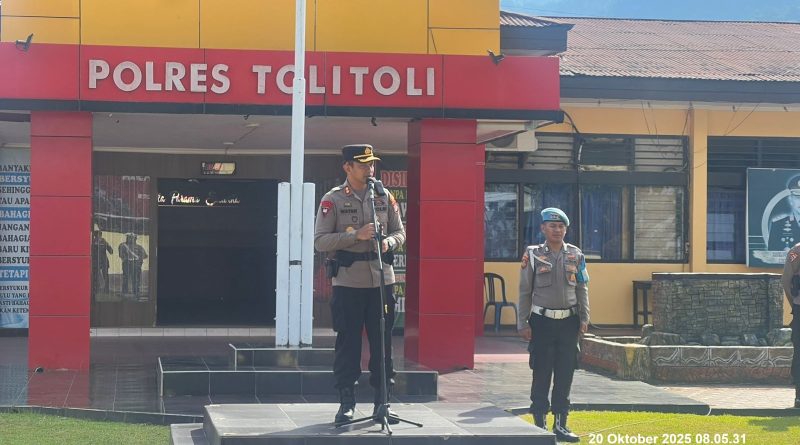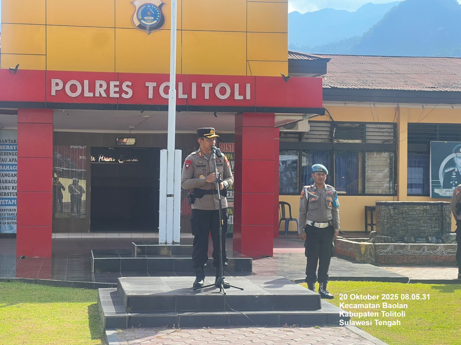 Tolitoli — Kapolres Tolitoli AKBP Wayan Wayracana Aryawan, SIK memimpin apel jam pimpinan di halaman Mapolres Tolitoli, Senin (20/10/2025), yang diikuti oleh seluruh personel jajaran, baik perwira, bintara, maupun ASN Polri.