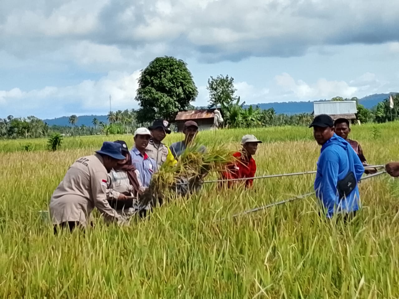Kegiatan ini berlangsung di, Desa Rantau Jaya, Kecamatan Simpang Raya, Banggai. Bhabinkamtibmas mengunjungi kelompok Tani Maju 1 untuk melakukan pengambilan sampling dari ubinan Tanaman padi.