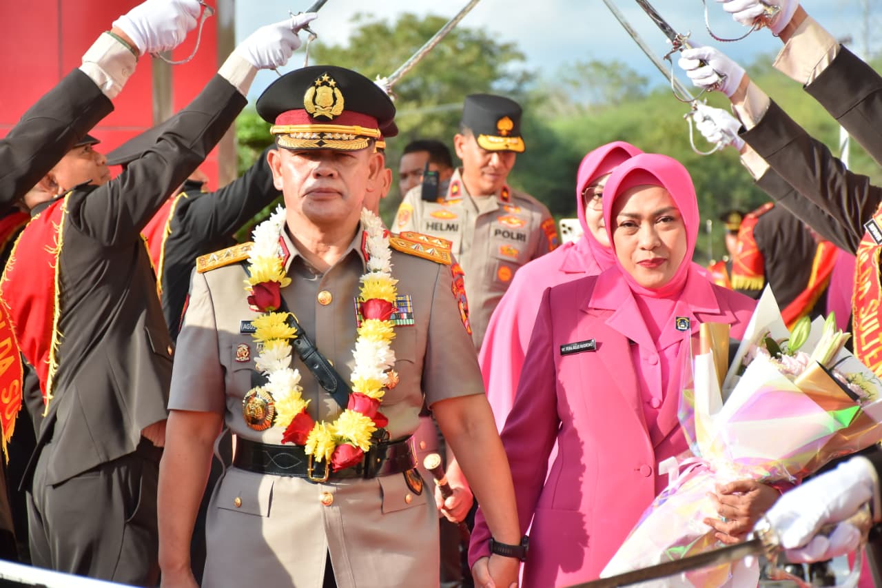 Nampak Kapolda Sulawesi Tengah yang baru, Irjen Pol Dr. Endi Sutendi, bersama Ketua Bhayangkari Daerah Sulteng, Ny. Ida Endi Sutendi, turut mendampingi hingga akhir prosesi.