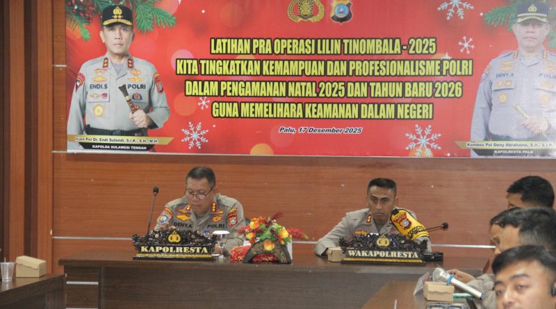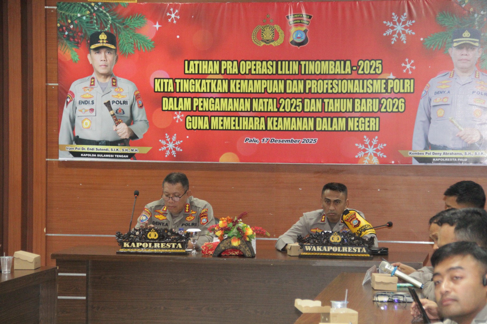 Palu – Kepala Kepolisian resor kota (Kapolresta) Palu Kombes Pol. Deny Abrahams, S.H., S.I.K., M.H., didampingi Wakapolresta palu AKBP Andi Batara Purwacaraka, S.H., S.I.K., menghadiri melalui zoom meeting Latihan Pra Operasi (Latpraops) Lilin Tinombala 2025, Rabu 17 Desember 2025 siang, di Aula Rupatama Polresta Palu.