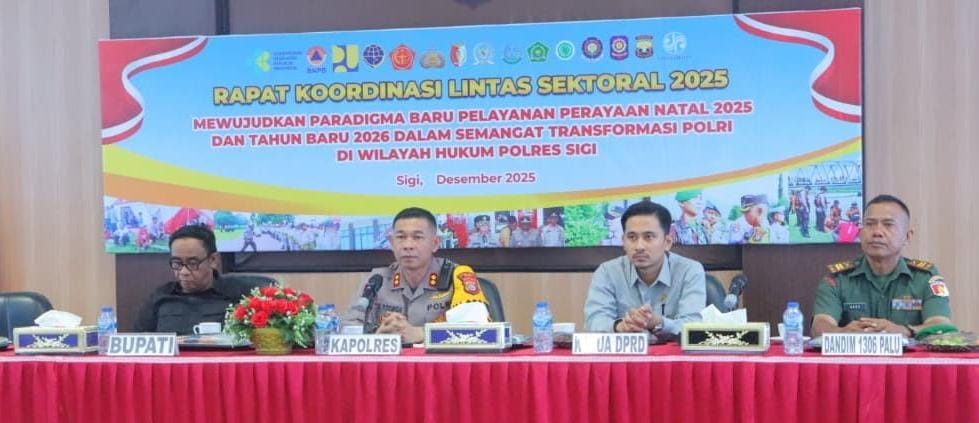 SIGI – Guna menyatukan persepsi dalam rangka pelayanan perayaan Natal 2025 dan Tahun Baru 2026, Polres Sigi menggelar Rapat Koordinasi (Rakor) Lintas Sektoral Operasi Lilin Tinombala 2025 di Aula Simpotove Polres Sigi, Jumat (19/12/2025).